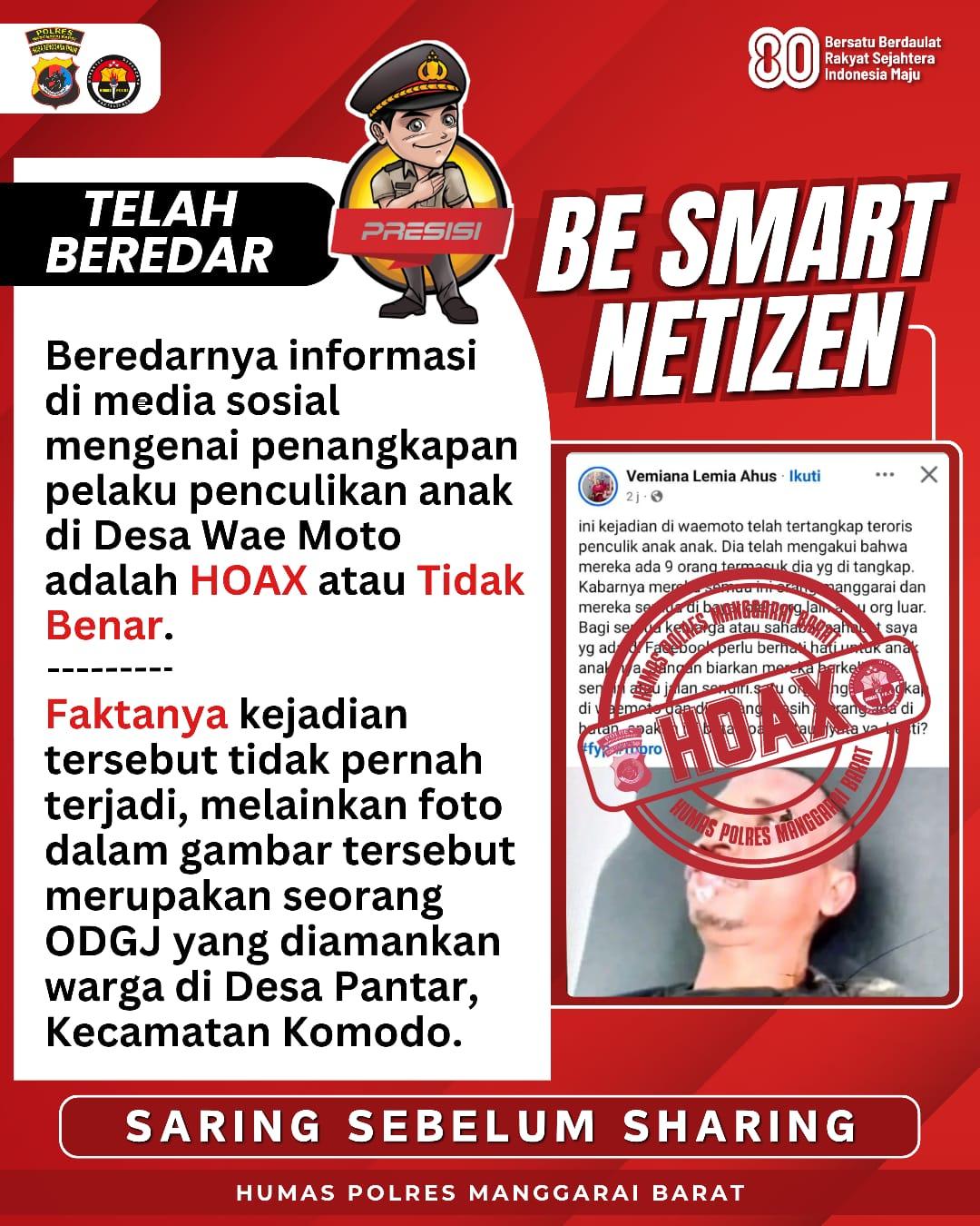 Labuan Bajo | Okebajo.com | Informasi liar terkait penculikan anak di Wae Moto, Kecamatan Mbeliling, Labuan Bajo, Manggarai Barat, NTT, yang sempat viral di media sosial adalah hoax. Polisi menyebut, peristiwa yang ramai disebut sebagai penangkapan pelaku penculikan anak itu ternyata orang dengan gangguan jiwa (ODGJ).