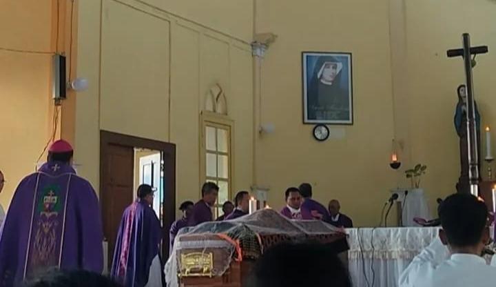 Di dalam Gereja, Yang Mulia Bapak Uskup Ruteng, Mgr. Siprianus Hormat memimpin Misa Pemakaman dengan penuh khidmat.